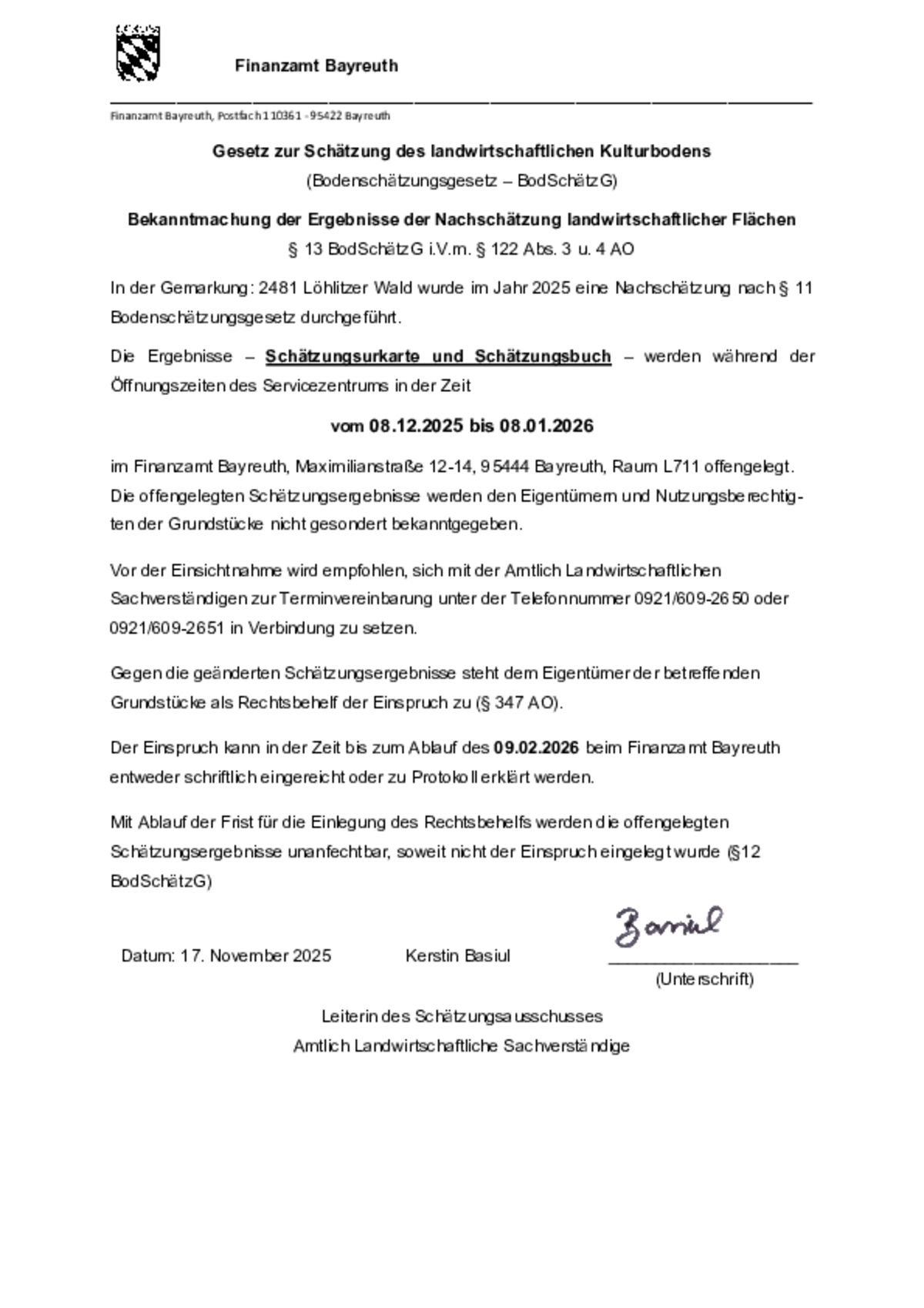 Der Einspruch kann in der Zeit bis zum Ablauf des 09.02.2026 beim Finanzamt Bayreuth