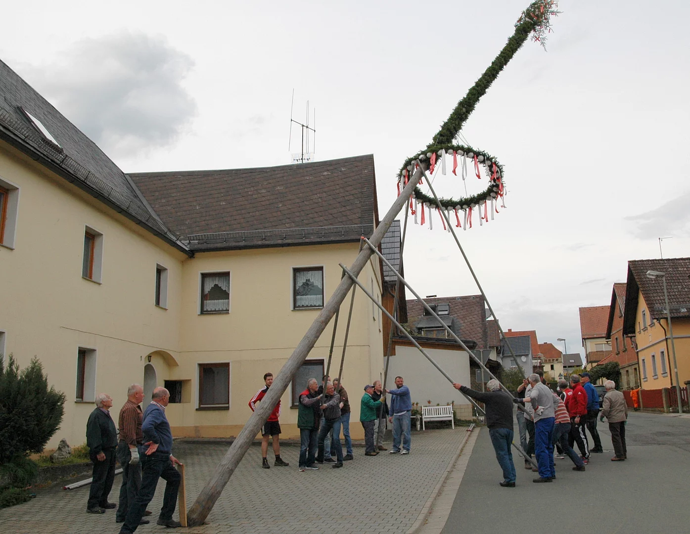 Der Hummeltrachten-Erhaltungsverein Mistelgau stellt in mühevoller Handarbeit jedes Jahr am 30. April einen Maibaum am Dorfplatz von Mistelgau auf. Der Stamm des Maibaum ist mit einer Girlande umwickelt, mit einem Kranz und mit Schilderbildern, die die Handwerksbetriebe in Mistelgau zeigen, geschmückt.