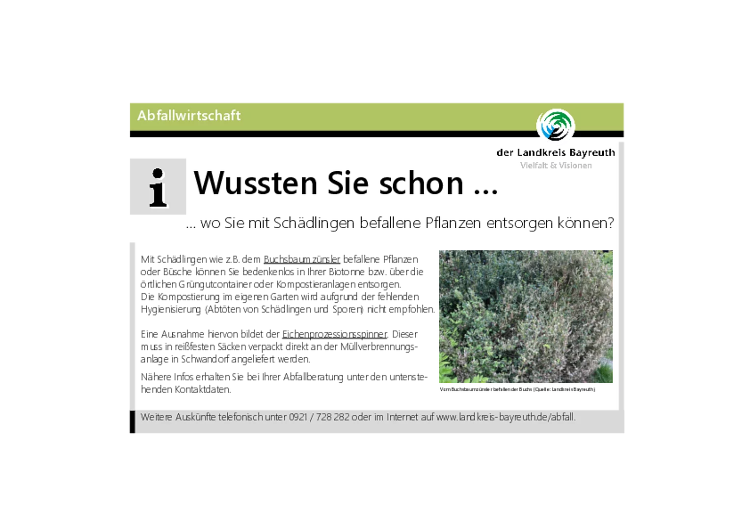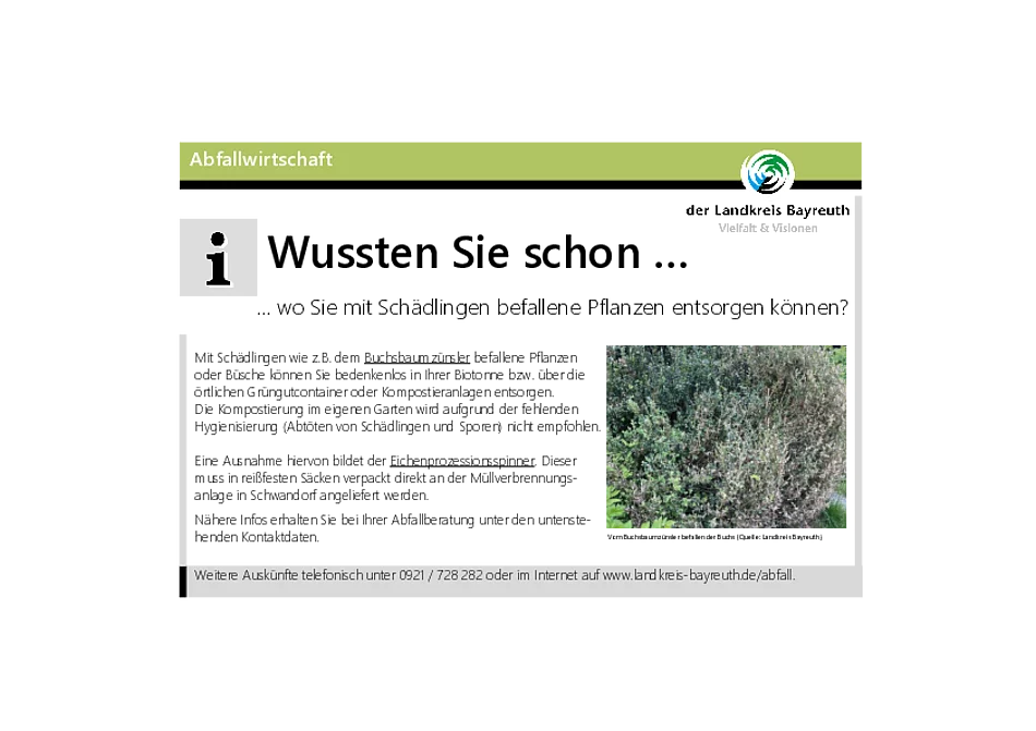 Mit Schädlingen wie z.B. dem Buchsbaumzünsler befallene Pflanzen oder Büsche können Sie bedenkenlos in Ihrer Biotonne bzw. über die örtlichen Grüngutcontainer oder Kompostieranlagen entsorgen. Die Kompostierung im eigenen Garten wird aufgrund der fehlenden Hygienisierung (Abtöten von Schädlingen und Sporen) nicht empfohlen. Eine Ausnahme hiervon bildet der Eichenprozessionsspinner. Dieser muss in reißfesten Säcken verpackt direkt an der Müllverbrennungs-anlage in Schwandorf angeliefert werden.