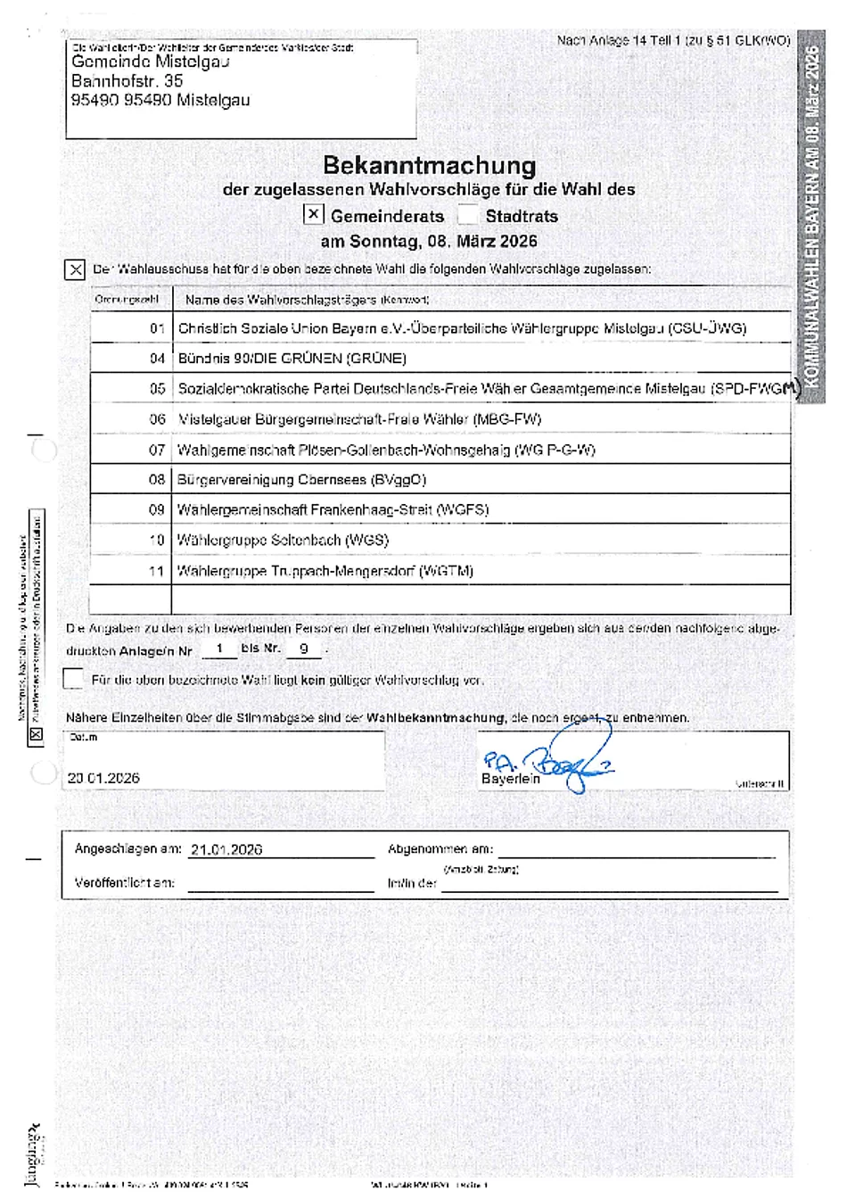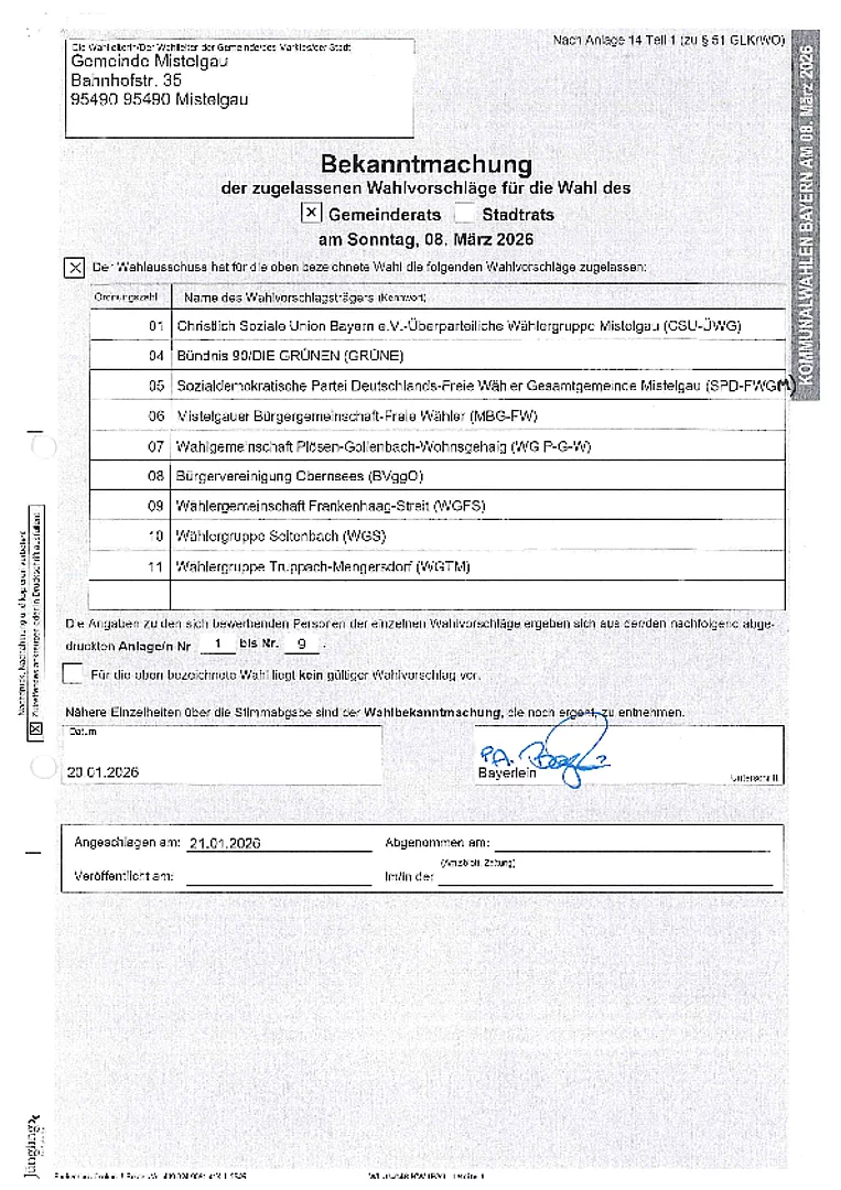 der zugelassenen Wahlvorschläge für die Wahl des Gemeinderats der Gemeinde Mistelgau