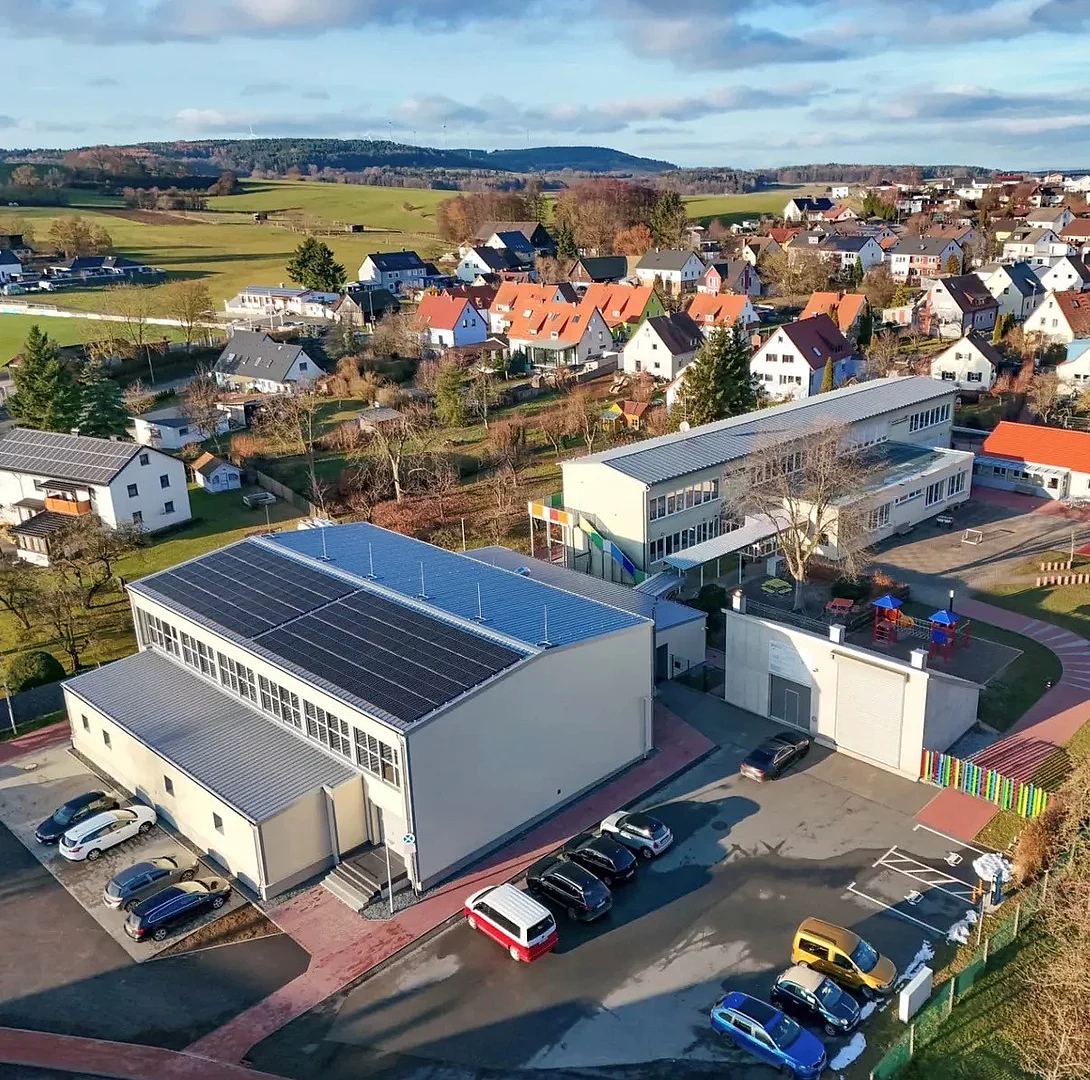 Auf dem Dach der Turnhalle entstand außerdem eine PV-Anlage mit Speicher, die möglichst lange sauberen Strom aus Sonnenenergie liefert.
