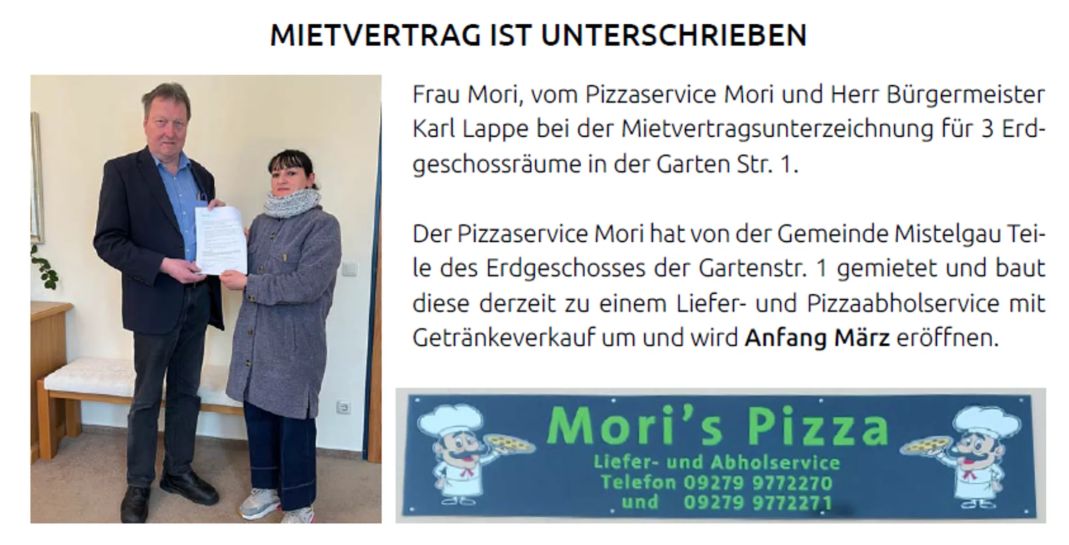 Frau Mori, vom Pizzaservice Mori und Herr Bürgermeister Karl Lappe bei der Mietvertragsunterzeichnung für 3 Erdgeschossräume