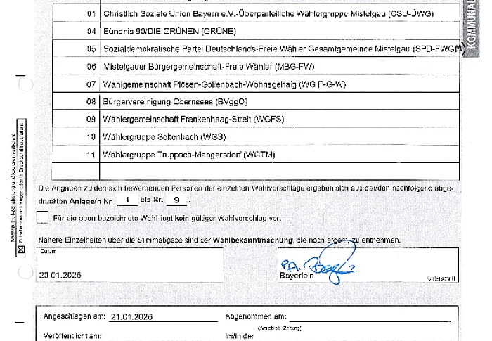 der zugelassenen Wahlvorschläge für die Wahl des ersten Bürgermeisters der Gemeinde Mistelgau