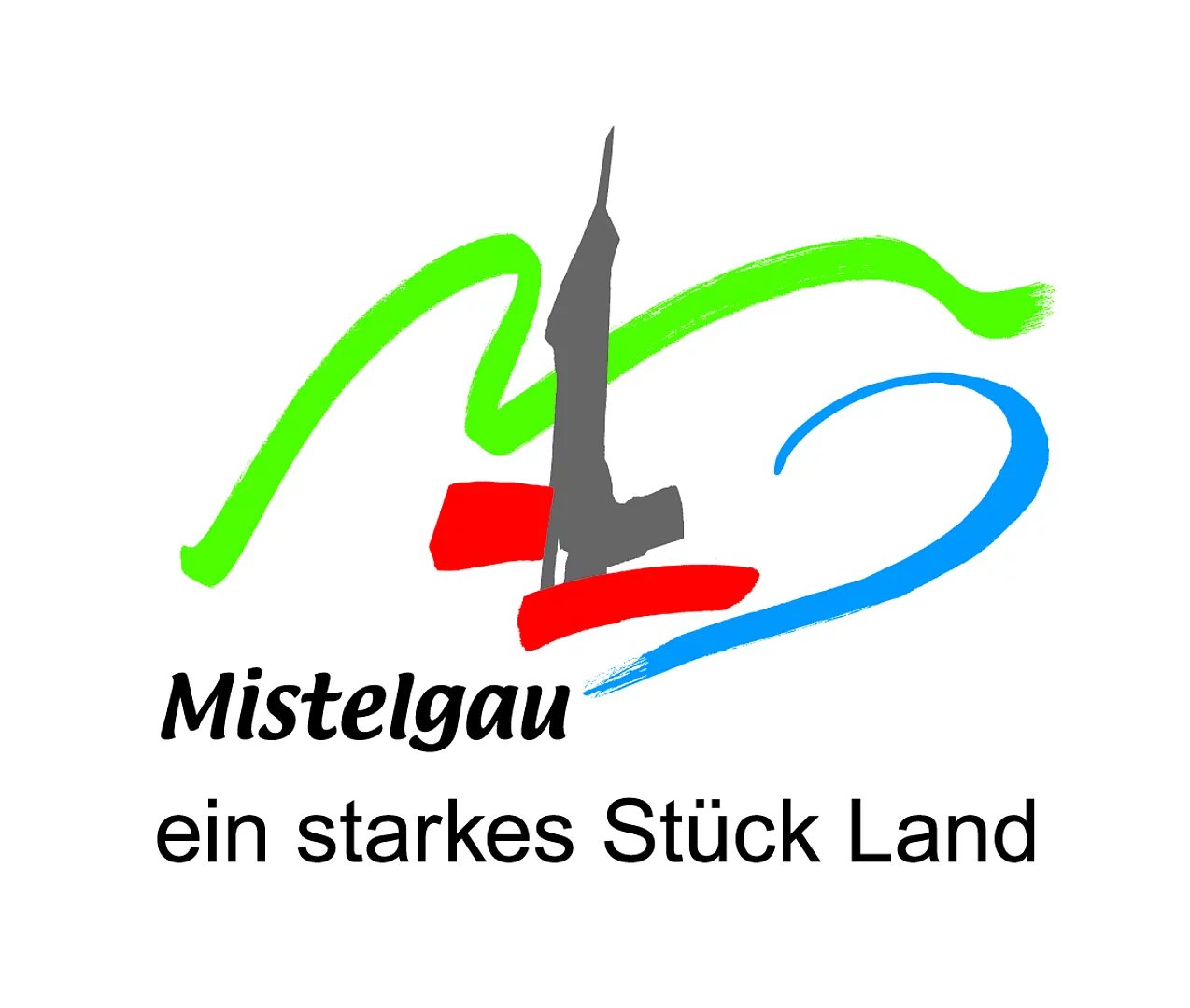 Die Gemeinde Mistelgau erscheint hier, mit dem nachobenstrebenden Kirchturm in der Mitte des Logos.
